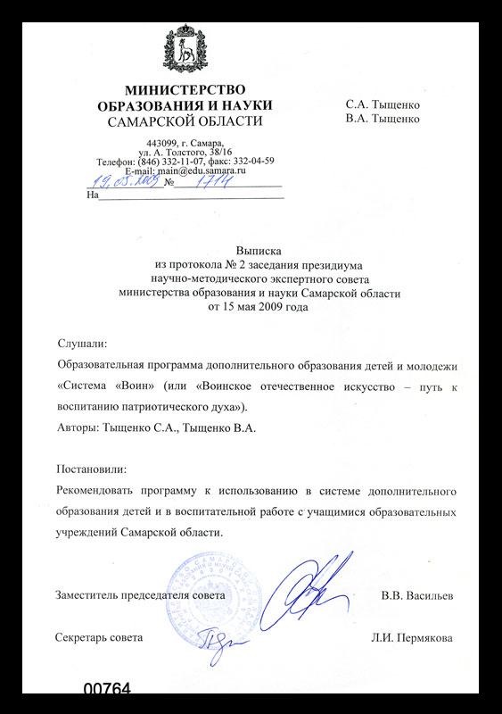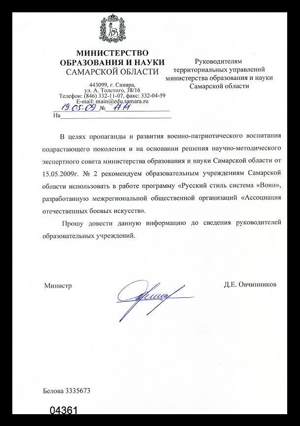 На основании постановления президиума научно-методического экспертного совета министерства образования и науки Самарской области от 15 мая 2009 года. А также распоряжения Министра образования и науки Самарской области Д.Е. Овчинникова от 15.05.2009 года. русский стиль система «ВОИН» будет использоваться в работе с учащимися общеобразовательных и высших учебных заведениях, а также в системе дополнительного образования Самарской области.