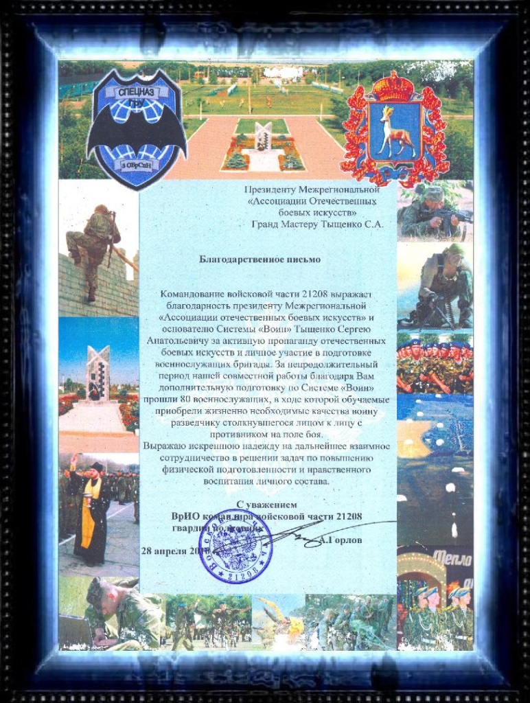 Командование части выражает благодарность президенту Межрегиональной "Ассоциации Отечественных боевых искусств" и основателю системы "ВОИН" Тыщенко Сергею Анатольевичу за активную пропаганду отечественных боевых искусств и личное участие в подготовке военнослужащих бригады, в ходе которой обучаемые приобрели жизненно необходимые качества воину разведчику, столкнувшемся лицом к лицу с противником на поле боя.