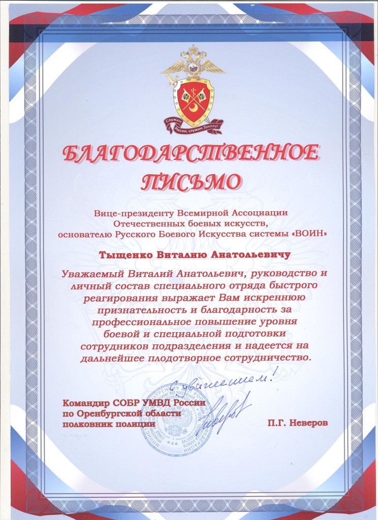 Благодарственное письмо от Специального Отряда Быстрого РеагированияРуководство и личный состав Специального Отряда Быстрого Реагирования выражает благодарность Тыщенко Виталию Анатольевичу за профессиональное повышение уровня боевой и специальной подготовке сотрудников подразделения