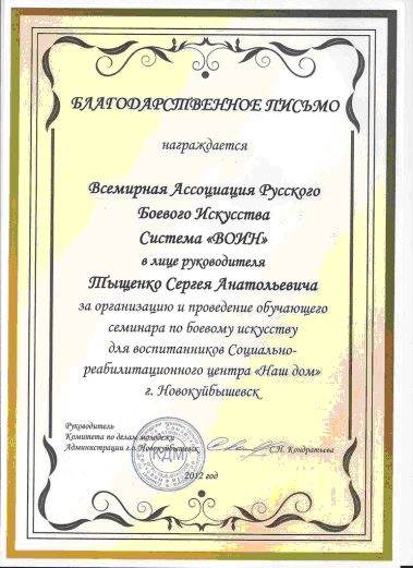 Семинар в НовокуйбышевскеБлагодарственное письмо от комитета по делам молодежи г. Новокуйбышевск.