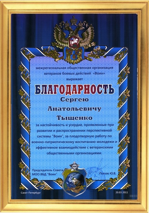 Благодарность от Межрегиональной общественной организации ветеранов боевых действий.Благодарность Тыщенко Сергею Анатольевичу от межрегиональной общественной организации ветеранов боевых действий ВОИН.