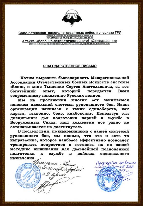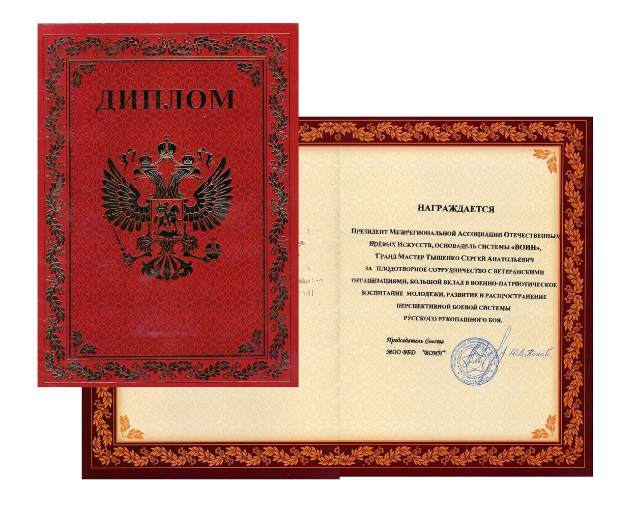 Диплом от Межрегиональной общественной организации Ветеранов боевых действий «ВОИН»Дипломом от Межрегиональной общественной организации Ветеранов боевых действий «ВОИН» за большой вклад в военно-патриотическое воспитание российской молодежи, развитие и распространение перспективной боевой системы «ВОИН» русского рукопашного боя в России и за ее пределами награжден Гранд Мастер Тыщенко С.А.