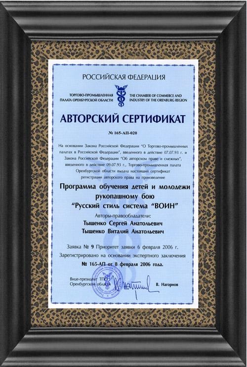 Авторский сертификатСертификат об авторских правах на систему «ВОИН» русского стиля рукопашного боя. Признание системы государством.